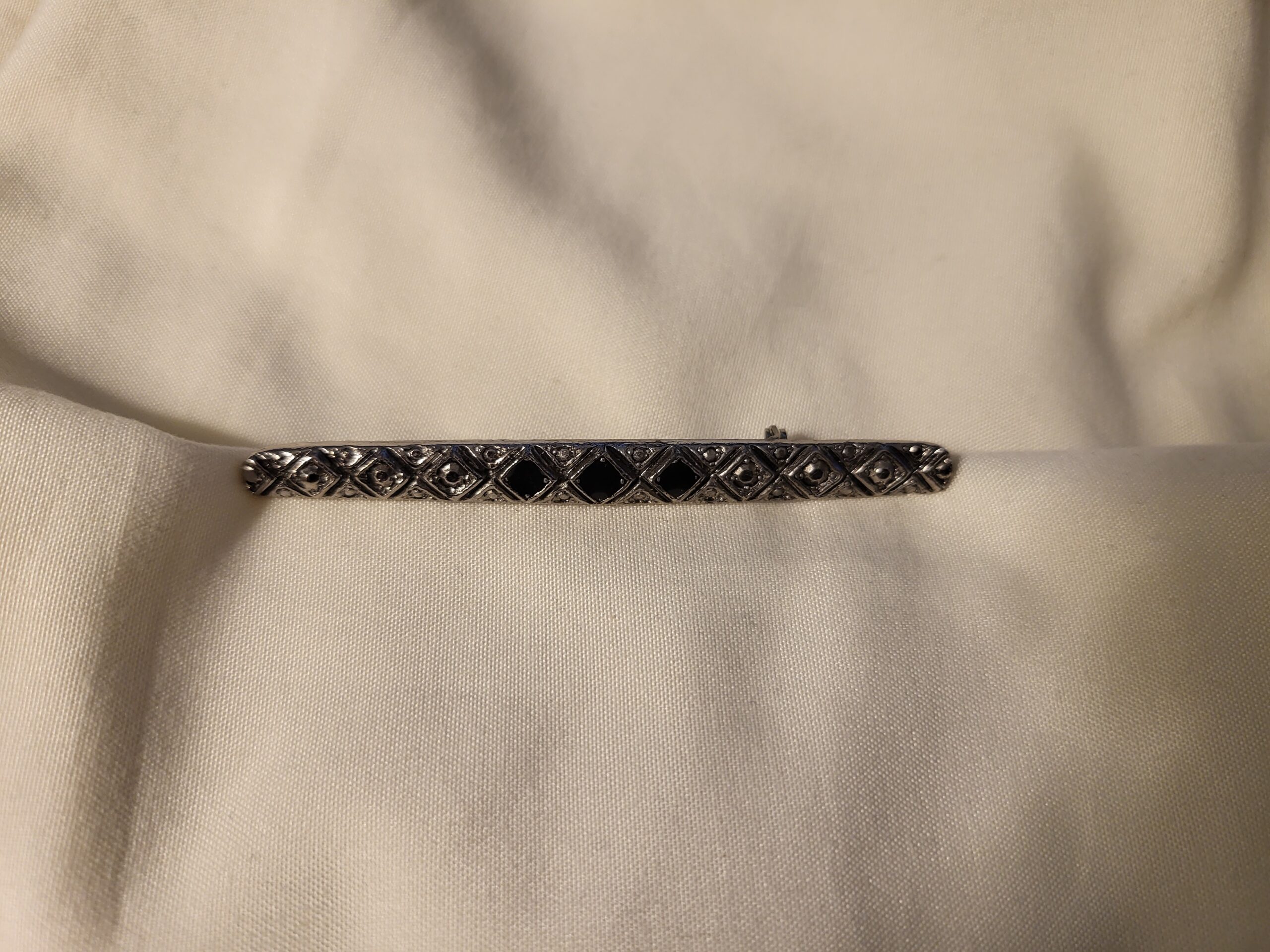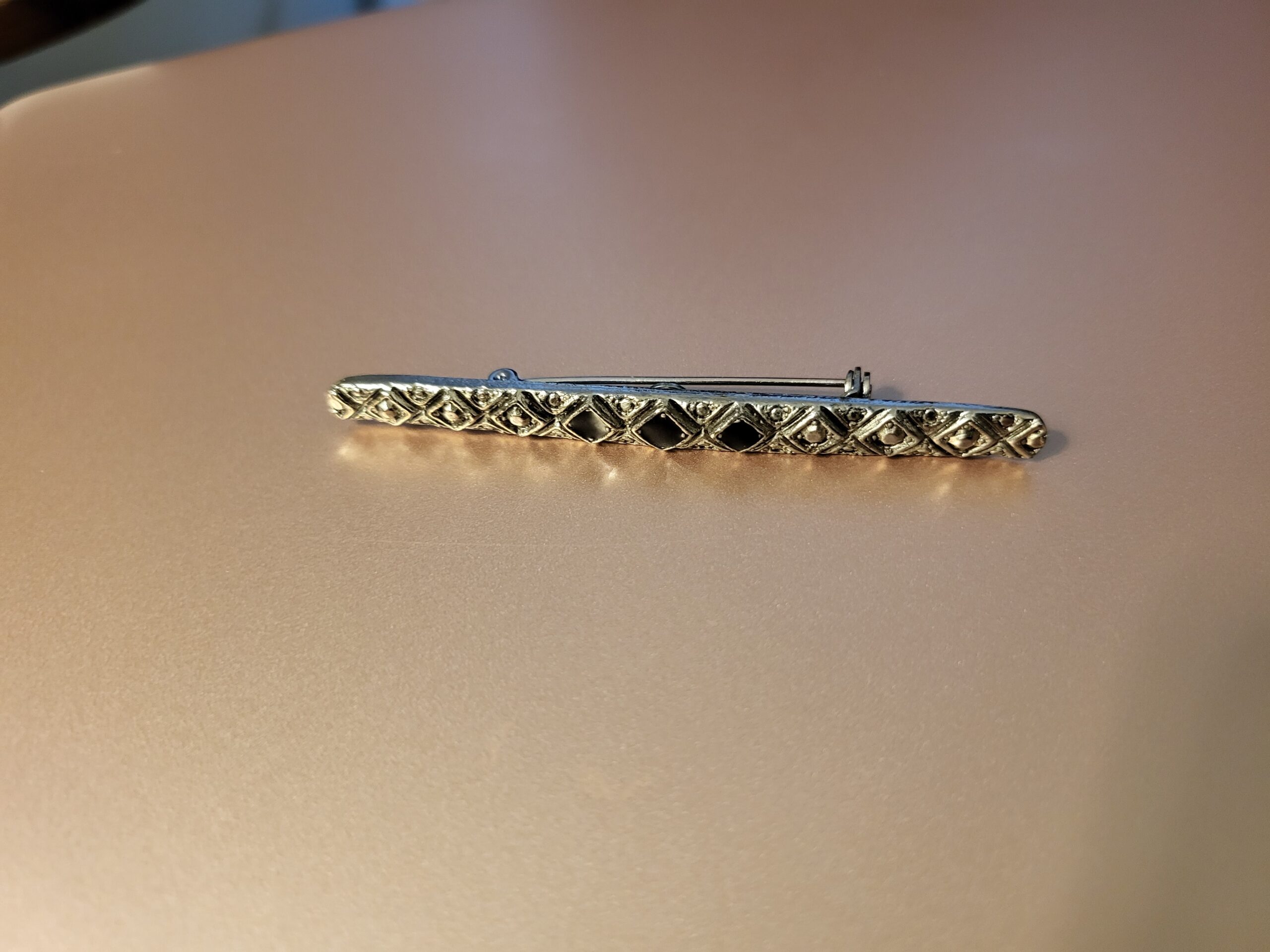 Be the first to review “Vintage Black Enamel Silver Tone Metal Faux Marcasite Bar Brooch”